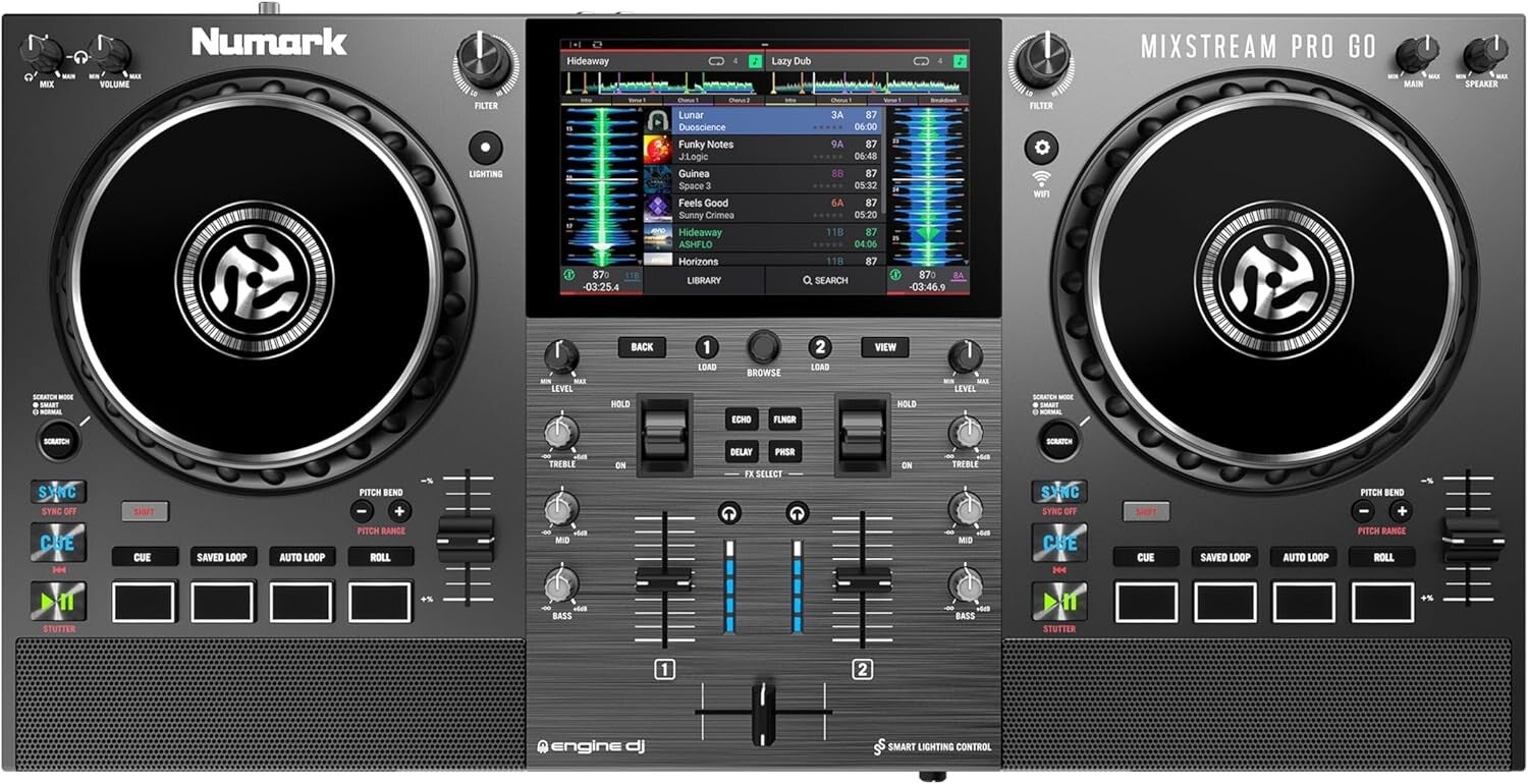 Numark Mixstream Pro Go - Controlador DJ portátil, batería, mezclador con separación de stems, altavoces, streaming wifi, pantalla táctil y Serato DJ